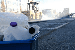 The project involved melting down plastic waste collected from landfills—such as yogurt containers, milk jugs, and sour cream tubs—into a wax-like substance. This material was then incorporated as a component in asphalt production.